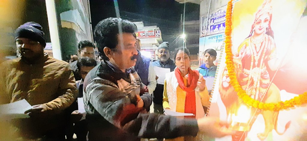 सोनभद्र। बाती गढ़ बलिदान की, ज्योति जला निज प्राण की,आओ हम सब चलें उतारें माँ की पावन आरती’ इसी आह्वान के साथ बुद्धवार को सायं 6 बजते ‘वंदेमातरम’ और ‘भारत माता की जय’ से सोनभद्र नगर का स्वर्ण जयंती चौक क्षेत्र गूंज उठा। गगनभेदी जय घोष सुनकर नगर वासी उत्साहित होकर भारतमाता की प्रतिमा पर माल्यार्पण किया और आरती मे सम्मिलित हुए।