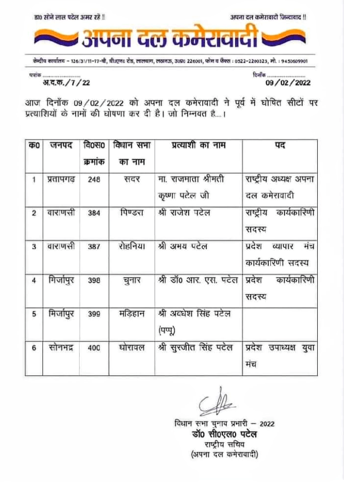 समाजवादी पार्टी गठबंधन में शामिल अपना दल (कमेरावादी) ने आज, बुधवार को पूर्व में घोषित सीटों पर प्रत्याशियों के नाम पर घोषणा कर दी है.