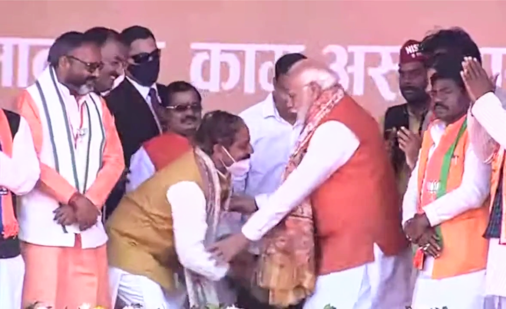 - बीजेपी जिला अध्यक्ष अजीत चौबे ने पीएम मोदी को अंगवस्त्रम प्रदान कर सम्मानित किया