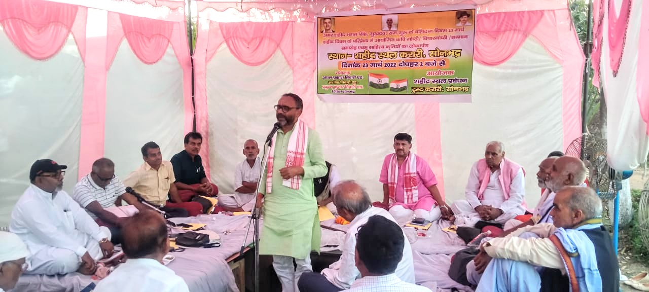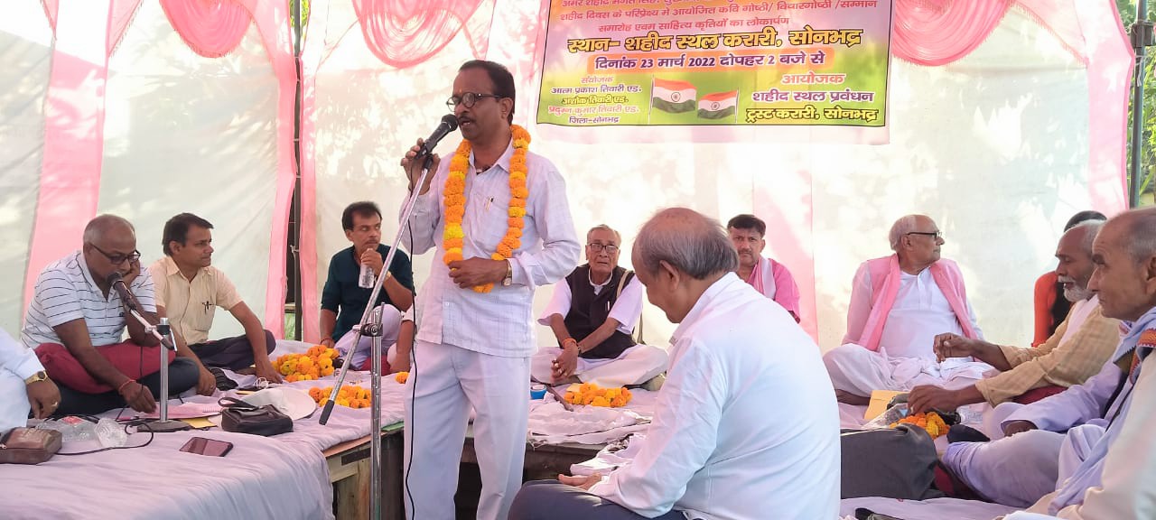 सोनभद्र। शहीद स्थल प्रबंधन ट्रस्ट करारी के तत्वावधान में शहीद दिवस (भगत सिंह सुखदेव राजगुरु के बलिदान दिवस) के अवसर पर करारी स्थित शहीद उद्यान कार्यक्रम में उपस्थित अतिथियों ने सरदार भगत सिंह, चंद्रशेखर आजाद, सुभाष चंद्र बोस को पुष्पांजलि से श्रद्धांजलि अर्पित किया। तत्पश्चात उपस्थित कवियों, विचारको, वक्ताओं का माल्यार्पण कर स्वागत किया गया।
