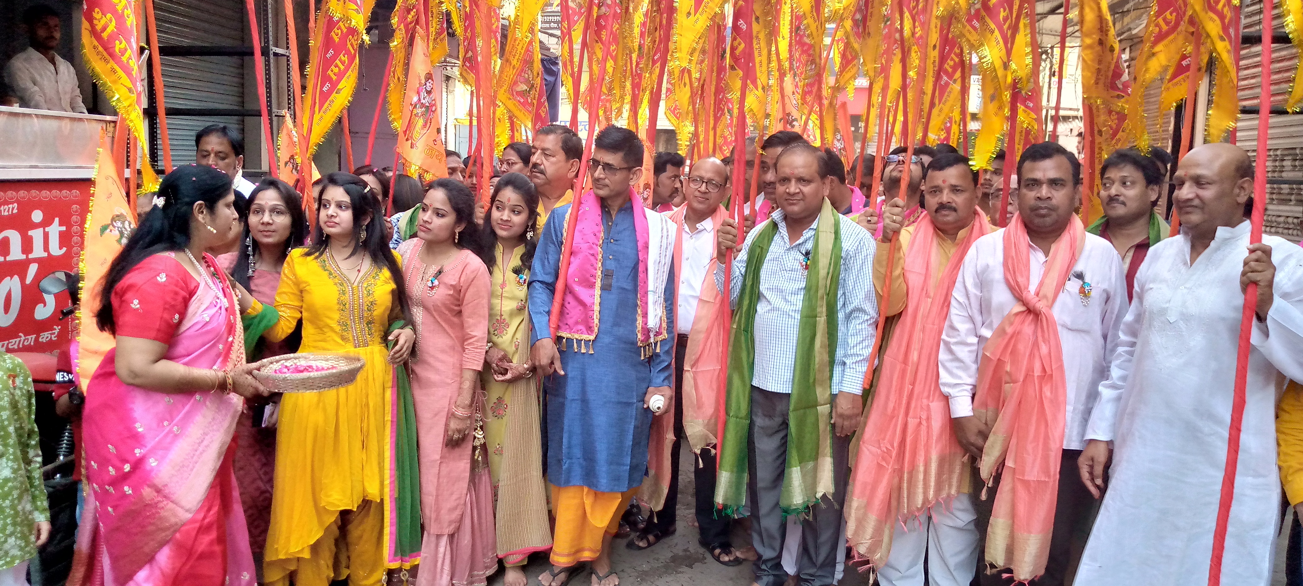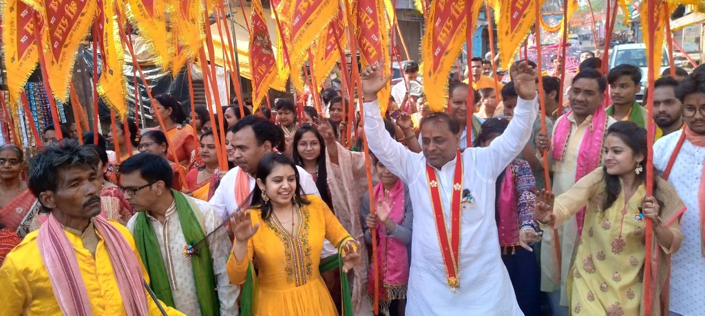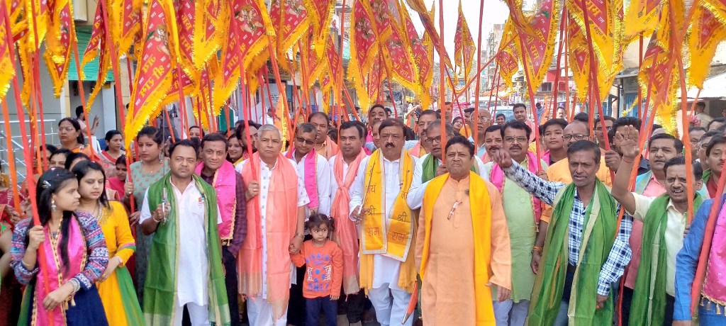 - निशान यात्रा में हाथों में भगवा ध्वज लिए शामिल हुए हनुमान भक्त
