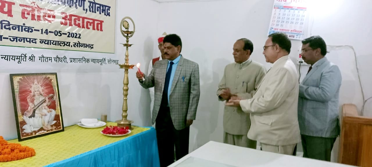 सोनभद्र। राष्ट्रीय विधिक सेवा प्राधिकरण के निर्देशन पर जनपद न्यायालय सोनभद्र के परिसर में जिला विधिक सेवा प्राधिकरण के तत्वाधान राष्ट्रीय लोक अदालत का आयोजन हुआ। न्यायमूर्ति डॉ गौतम चौधरी माननीय उच्च न्यायालय इलाहाबाद /प्रशाशनिक अधिकारी सोनभद्र ने मां सरस्वती के प्रतिमा पर दीप प्रज्वलित कर शुभारंभ किया।