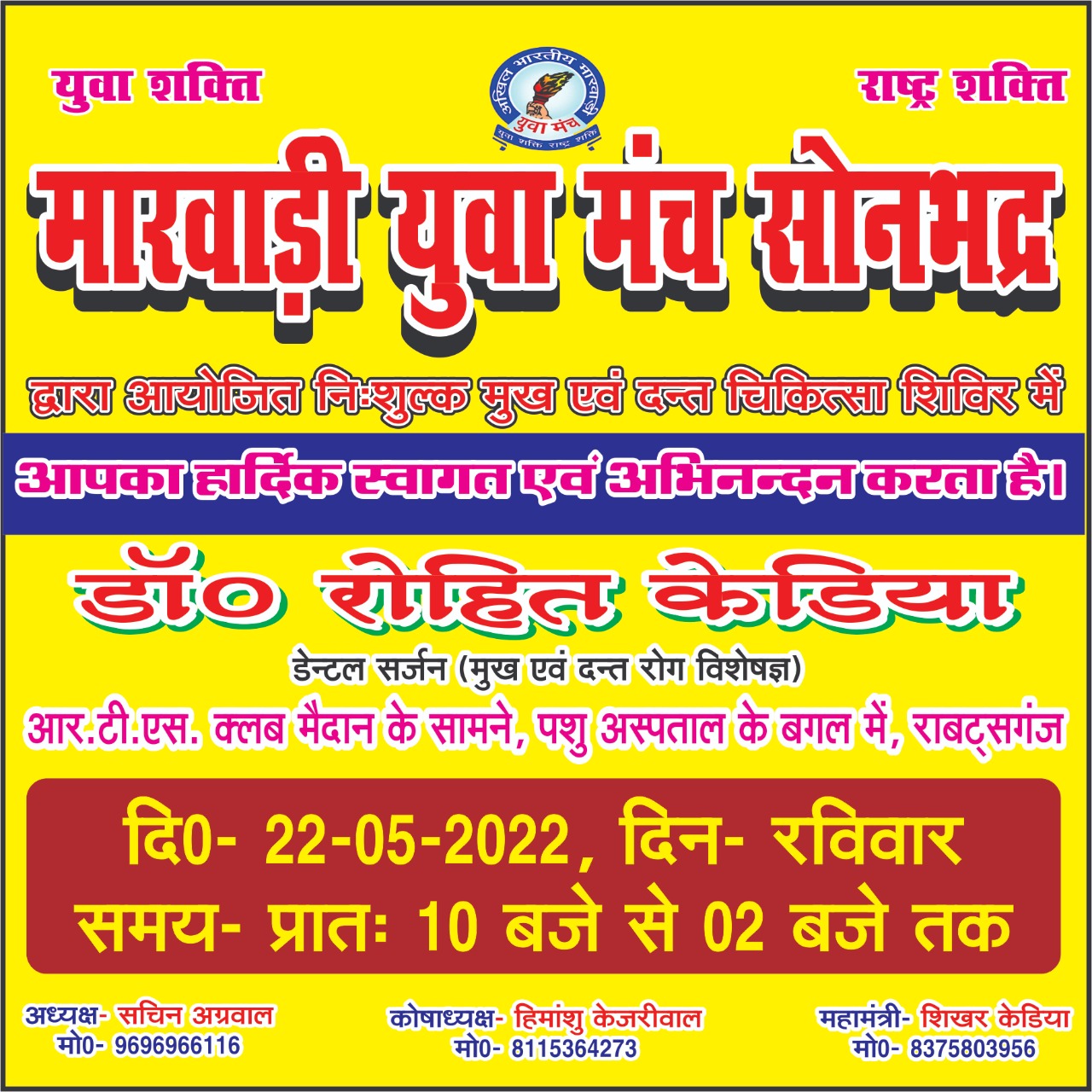मारवाड़ी युवा मंच सोनभद्र शाखा के महामंत्री शेखर केडिया ने एक प्रेस विज्ञप्ति के माध्यम से बताया है कि मंच द्वारा हर महीने एक नि:शुल्क मुख एवं दंत चिकित्सा शिविर का आयोजन किया जाएगा जिसमें लोगों की मुख एवं दांत की निशुल्क जांच की जाएगी। उन्होंने सभी नगर वासियों से अपील है की शिविर में अपनी उपस्थिति जरूर दर्ज कराएं।