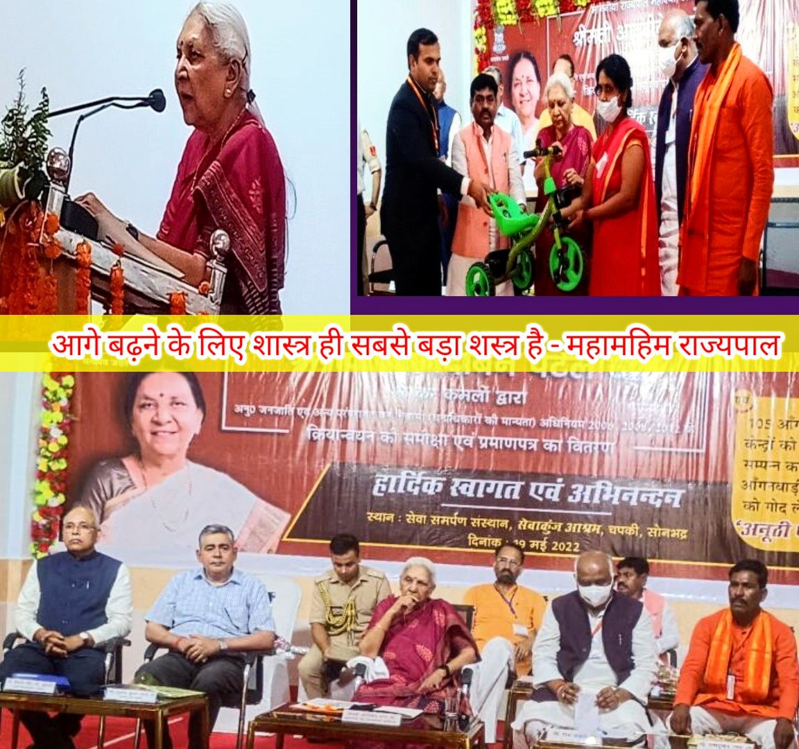 सोनभद्र। जनपद में दो दिवसीय दौरे पर आई उत्तर प्रदेश की राज्यपाल आनंदीबेन पटेल ने जनपद के आदिवासी बाहुल्य ब्लाक बभनी स्थित सेवा समर्पण संस्थान सेवा कुंज आश्रम चपकी में बृहस्पतिवार को आयोजित कार्यक्रम में कहा कि आगे बढ़ने का सबसे उपयोगी शस्त्र है आदिवासी परिवारों को बच्चों को अच्छी शिक्षा देनी चाहिए। सरकारी योजनाएं हमें बुनियादी जरूरतों के लिए आश्वस्त करती हैं, लेकिन सिर्फ उसके सहारे हम आगे नहीं बढ़ सकते। अपने बच्चों के बेहतर भविष्य के लिए हर आदिवासी-वनवासी परिवार उन्हें बेहतर शिक्षा देने का संकल्प लें।