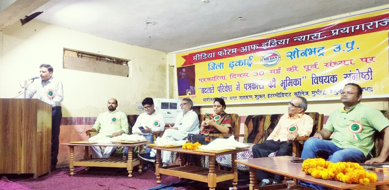 सोनभद्र। मीडिया फोरम ऑफ इंडिया न्यास जिला इकाई सोनभद्र के तत्वधान में पं जगत नारायण शुक्ल इण्टर कालेज मुर्धवां के सभगार में हिन्दी पत्रकारिता दिवस की 196 वीं जयंती की पूर्व संध्या पर विविध कार्यक्रम आयोजित किए गए। ‘बदलते परिवेश में पत्रकारों की भूमिका’ विषय पर गोष्ठी हुई तो विभिन्न क्षेत्रों में उल्लेखनीय योगदान करने वाले 21 महानुभावों का सारस्वत सम्मान किया गया और पत्रकारों व गणमान्यों को प्रशस्तिपत्र प्रदान कर सम्मानित किया गया।