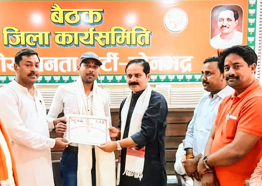 सोनभद्र। प्रधानमंत्री नरेंद्र मोदी के सुशासन एवं सफलतम 8 साल का कार्यकाल पूर्ण होने के उपलक्ष में पार्टी द्वारा 30 मई से 13 जून तक चलाए जा रहे सुशासन पखवारा के अंतर्गत शनिवार को भारतीय जनता पार्टी सोनभद्र द्वारा जनपद मुख्यालय रॉबर्ट्सगंज स्थित पार्टी के जिला कार्यालय पर वरिष्ठ साहित्यकार अजय शेखर की अध्यक्षता एवं भारतीय जनता पार्टी के जिला अध्यक्ष अजीत चौबे के मुख्य आतिथ्य एवं सदर ब्लाक प्रमुख अजीत रावत, पूर्व जिला पंचायत अध्यक्ष अमरेश पटेल, भाजपा के जिला महामंत्री कृष्ण मुरारी गुप्ता के विशिष्ट आतिथ्य में विभिन्न क्षेत्रों में उत्कृष्ट एवं उल्लेखनीय कार्य करने वाले सोनभद्र वासियों को सम्मानित किया गया।
