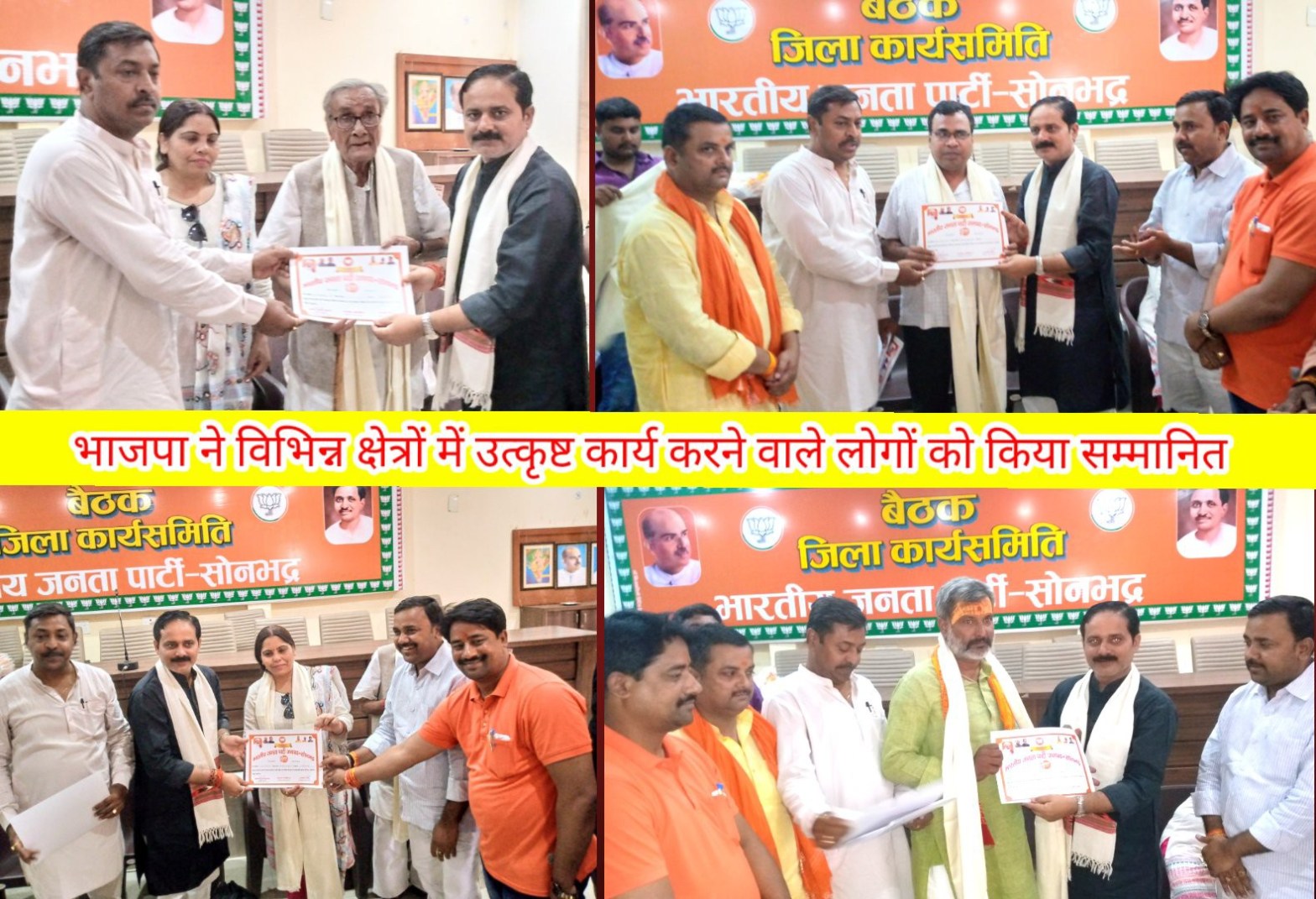 सोनभद्र। प्रधानमंत्री नरेंद्र मोदी के सुशासन एवं सफलतम 8 साल का कार्यकाल पूर्ण होने के उपलक्ष में पार्टी द्वारा 30 मई से 13 जून तक चलाए जा रहे सुशासन पखवारा के अंतर्गत शनिवार को भारतीय जनता पार्टी सोनभद्र द्वारा जनपद मुख्यालय रॉबर्ट्सगंज स्थित पार्टी के जिला कार्यालय पर वरिष्ठ साहित्यकार अजय शेखर की अध्यक्षता एवं भारतीय जनता पार्टी के जिला अध्यक्ष अजीत चौबे के मुख्य आतिथ्य एवं सदर ब्लाक प्रमुख अजीत रावत, पूर्व जिला पंचायत अध्यक्ष अमरेश पटेल, भाजपा के जिला महामंत्री कृष्ण मुरारी गुप्ता के विशिष्ट आतिथ्य में विभिन्न क्षेत्रों में उत्कृष्ट एवं उल्लेखनीय कार्य करने वाले सोनभद्र वासियों को सम्मानित किया गया।