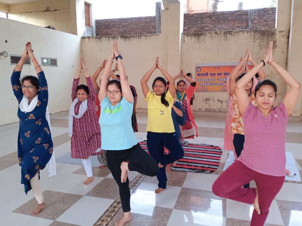 सोनभद्र। अंतरराष्ट्रीय योग दिवस पर मारवाड़ी सोन महिला सोनभद्र एवम मारवाड़ी युवा मंच के संयुक्त तत्वाधान में जिला मुख्यालय राबर्ट्सगंज स्थित बैंक ऑफ बड़ौदा के पास राजस्थान भवन में योग शिविर का आयोजन किया गया। जिसमें कि मंच के पदाधिकारियों एवं सदस्यों ने योगाभ्यास किया।