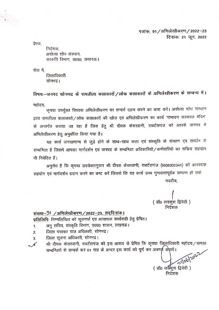 सोनभद्र। देश-विदेश भारतीय रामलीला के प्रचार- प्रसार हेतु भारत सरकार द्वारा चलाई जा रही रामायण कल्चर मैपिंग योजना के अंतर्गत संस्कृति विभाग उत्तर प्रदेश की इकाई अयोध्या शोध संस्थान द्वारा प्रदेश के 75 जनपद सहित सोनभद्र जनपद के ग्रामीण, नगरीय, शहरी क्षेत्रों में रामलीला सहित अन्य लोककला विधाओं का प्रदर्शन करने वाले कलाकारों की खोज व सूचीबद्ध करने एवं योग्य कलाकारों को विदेशो में प्रदर्शन कराने और उन्हें रोजगार परक बनाने के लिए रामलीला में राम से लेकर वानर तक की भूमिका निभाने वाले कलाकारों को सूचीबद्ध एवं उनके विस्तृत जानकारी के लिए बुकलेट के प्रकाशन के संकलन हेतु अयोध्या शोध संस्थान लखनऊ द्वारा वरिष्ठ साहित्यकार, इतिहासकार, विंध्य संस्कृति शोध समिति उत्तर प्रदेश ट्रस्ट के निदेशक दीपक कुमार केसरवानी को सोनभद्र जनपद का कोऑर्डिनेटर बनाया गया है। इस आशय का पत्र अयोध्या शोध संस्थान के निदेशक डॉक्टर लवकुश द्विवेदी द्वारा जिलाधिकारी सोनभद्र को प्रेषित कर दिया गया है।