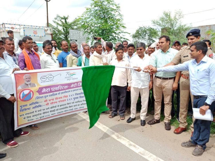 आज कलेक्ट्रेट गेट के पास संतोष कुमार यादव, अतिरिक्त सचिव, भारत सरकार/ नोडल अधिकारी नीति आयोग, चंद्र विजय सिंह, जिलाधिकारी, डॉ यशवीर सिंह, पुलिस अधीक्षक एवं मुख्य विकास अधिकारी सौरभ गंगवार ने हरी झंडी दिखा कर प्लास्टिक से लदे वाहनों को रवाना किया जिसे स्वयं जिलाधिकारी ने अल्ट्राकेट फैक्ट्री को सौंपा। वही नोडल अधिकारी संतोष यादव ने कहा कि यह अभियान अपने आप में एक नवीन अभियान है। इससे पर्यावरण को नुकसान होने से बचा लेंगे। जिलाधिकारी चंद्र विजय सिंह ने बताया कि इस अभियान का सबसे मुख्य बिंदु यह है कि घरों पर लोगों को प्लास्टिक उसी घर में संकलित किए जाने के लिए समझाया गया और लोगों ने प्लास्टिक को बाहर फेंकने की जगह अपने घर पर टंगी बोरी में ही रखी। ग्राम पंचायत के द्वारा वह प्लास्टिक इकट्ठा कर उसको निस्तारण के लिए अल्ट्राटेक सीमेंट फैक्ट्री को उपलब्ध कराया गया।