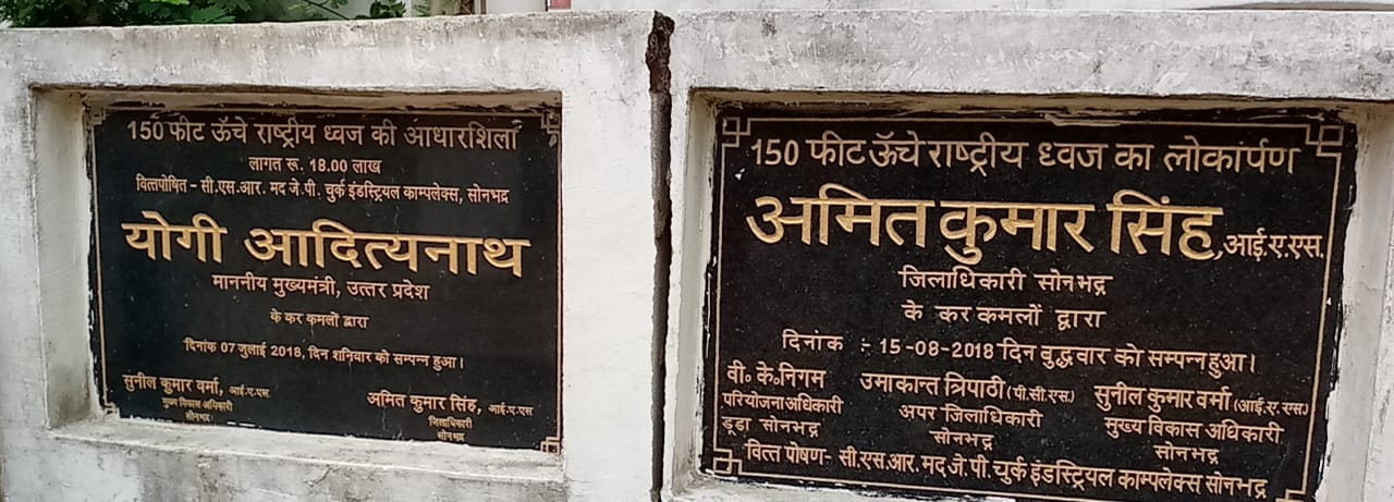 जनपद में आजादी के अमृत महोत्सव वर्ष के अंतर्गत तमाम प्रकार के कार्यक्रमों का आयोजन हुआ और शासन- प्रशासन के निर्देश पर जनमानस की सहभागिता भी रही, लेकिन जिले के आला कमान अधिकारी इस तथ्य को भूल गए कि कलेक्ट्रेट प्रांगण में स्थित गांधी उद्यान में 15 अगस्त 2018, दिन बुधवार को तत्कालीन जिलाधिकारी अमित कुमार सिंह द्वारा 150 फीट ऊंचे ध्वज का लोकार्पण किया गया था, इसकी आधारशिला प्रदेश के यशस्वी मुख्यमंत्री योगी आदित्यनाथ द्वारा 7 जुलाई 2018, दिन शनिवार को कलेक्ट्रेट प्रांगण में समारोह पूर्वक रखी गयी थी। इस ऐतिहासिक दिवस के साक्षी बने थे सोनभद्र के अधिकारी एवं नागरिकगण।