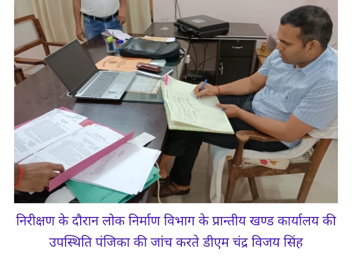 सोनभद्र। जिलाधिकारी चन्द्र विजय सिंह ने मंगलवार को लोक निर्माण विभाग के प्रान्तीय खण्ड कार्यालय का औचक निरीक्षण किया। निरीक्षण के दौरान जिलाधिकारी ने सर्वप्रथम उपस्थिति पंजिका का निरीक्षण किया। उपस्थिति पंजिका के निरीक्षण में गोरखनाथ वरिष्ठ सहायक अनुपस्थित पाये गये, जिस पर जिलाधिकारी ने अधिशासी अभियन्ता लोक निर्माण विभाग अजीत कुमार यादव को निर्देशित किया कि सम्बन्धित अनुपस्थित कर्मी से स्पष्टीकरण प्राप्त करें।