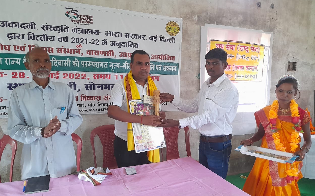 सोनभद्र। आजादी के अमृत महोत्सव वर्ष के अंतर्गत संगीत नाटक अकादमी भारत सरकार नई दिल्ली व जनजातीय शोध एवं विकास संस्थान, वाराणसी के संयुक्त तत्वावधान में ग्राम पंचायत बरवा टोला, विकास खंड- बभनी के सभागार मे आयोजित सम्मान समारोह में आदिवासी, संस्कृति, साहित्य, कला के अध्येता, इतिहासकार, संस्कृति विशेषज्ञ संस्कृति विभाग, उत्तर प्रदेश लखनऊ, रामायण कल्चर मैपिंग योजना के डिस्ट्रिक्ट कोऑर्डिनेटर दीपक कुमार केसरवानी को अनवरत तीन दशकों से आदिवासी संस्कृति साहित्य कला पर शोध कार्य करने एवं केंद्रीय हिंदी निदेशालय भारत सरकार नई दिल्ली द्वारा प्रकाशित शोध ग्रंथ आदिवासी कृति के लेखन आदिवासी कला के संरक्षण हेतु आयोजक संस्थान के प्रबंधक/ सचिव बृजभान मरावी ने माल्यार्पण कर अंगवस्त्रम एवं स्मृति चिन्ह प्रदान कर सम्मानित किया।