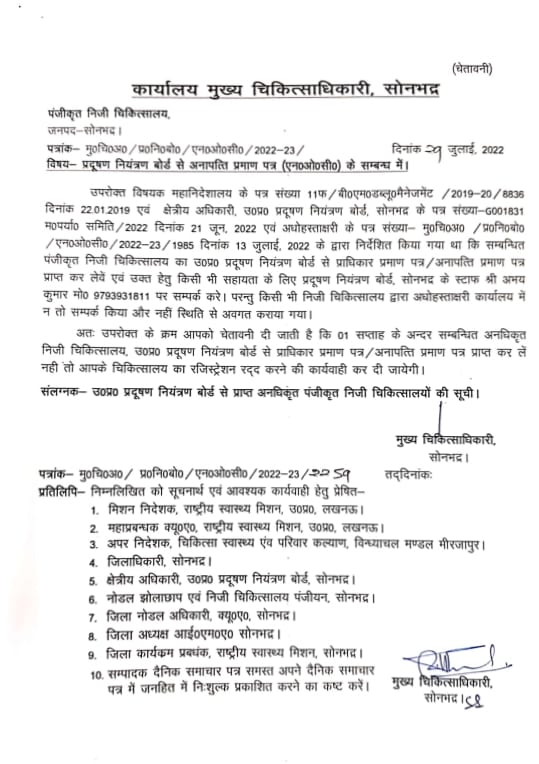सोनभद्र। क्षेत्रीय अधिकारी प्रदूषण नियंत्रण बोर्ड जनपद सोनभद्र ने बताया है कि पंजीकृत निजी चिकित्सालय अपना उत्तर प्रदेश प्रदूषण नियंत्रण बोर्ड से प्राधिकार प्रमाण पत्र/अनापत्ति प्रमाण पत्र प्राप्त कर ले। उन्होंने बताया कि प्रमाण पत्र न प्राप्त करने की दशा में निजी चिकित्सालय पर उचित कार्यवाही की जायेगी। उन्होंने बताया है कि 13 जुलाई 2022 को जारी पत्र के अनुसार सभी चिकित्सालयों को आदेशित किया गया था कि सभी अपना प्रमाण पत्र प्राप्त कर ले, लेकिन निजी चिकित्सालयों ने कार्यालय में न तो सम्पर्क किया और ना ही स्तिथि से अवगत कराया। उन्होंने सभी निजी पंजीकृत चिकित्सालय को चेतावनी देते हुए कहा है 1 सप्ताह के अन्दर निजी चिकित्सालय उत्तर प्रदेश प्रदूषण नियंत्रण बोर्ड से प्राधिकार प्रमाण पत्र प्राप्त कर लें नहीं तो चिकित्सालयों का रजिस्ट्रेशन रदद् कर दिया जायेगा।