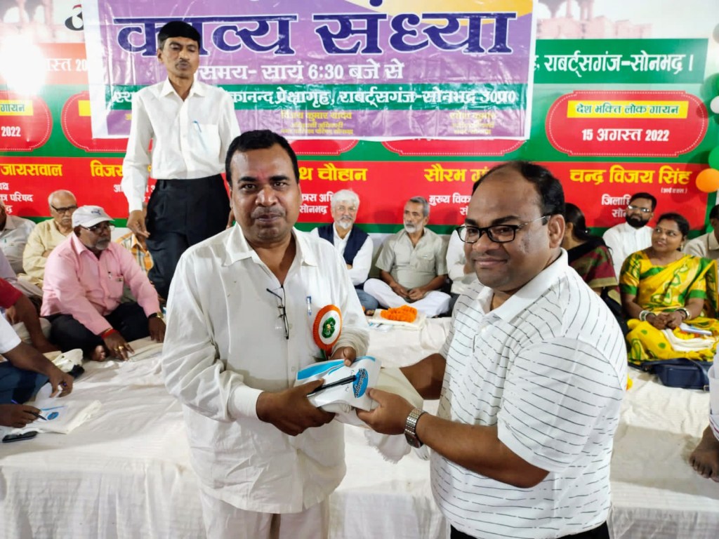 जिला प्रशासन एवं नगर पालिका परिषद द्वारा शाम को स्वामी विवेकानंद प्रेक्षागृह रॉबर्ट्सगंज में आयोजित काव्य संध्या में सदर तहसील दार ने भी लेखनी, पुस्तिका, अंगवस्त्रम प्रदान कर सम्मानित किया।