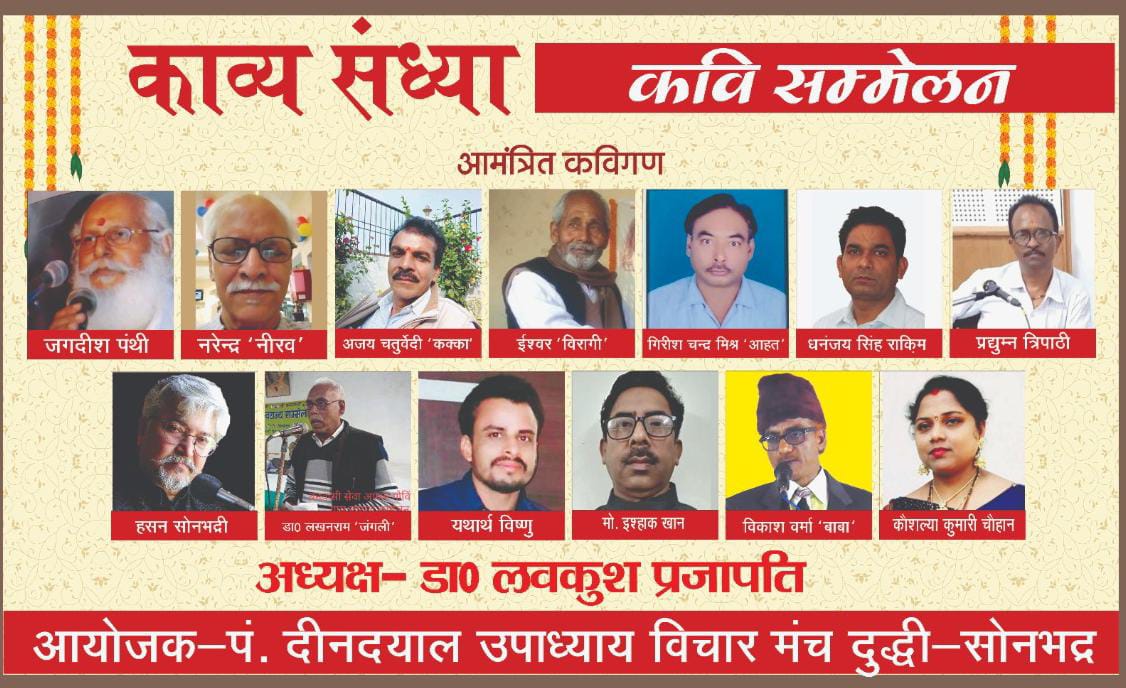 वही रात्रि 9:00 बजे वीर रस, हास्य रस, श्रृंगार रस, करुण रस, से ओतप्रोत काव्य पाठ देश के जाने माने कवि शायर करेगे। काव्य संध्या में सुप्रसिद्ध गीतकार जगदीश पंथी, अजय चतुर्वेदी कक्का, ईश्वर विरागी, गिरीश चंद आहत, धनंजय सिंह रकीम, प्रदुम त्रिपाठी, हसन सोनभदी, डॉक्टर लखन राम जंगली, यथार्थ विष्णु, दिल्ली दूरदर्शन केंद्र के मोहम्मद इसहाक खान, विकास वर्मा, कौशल्या कुमारी चौहान आदि कवि एवं शायर शिरकत करेंगे