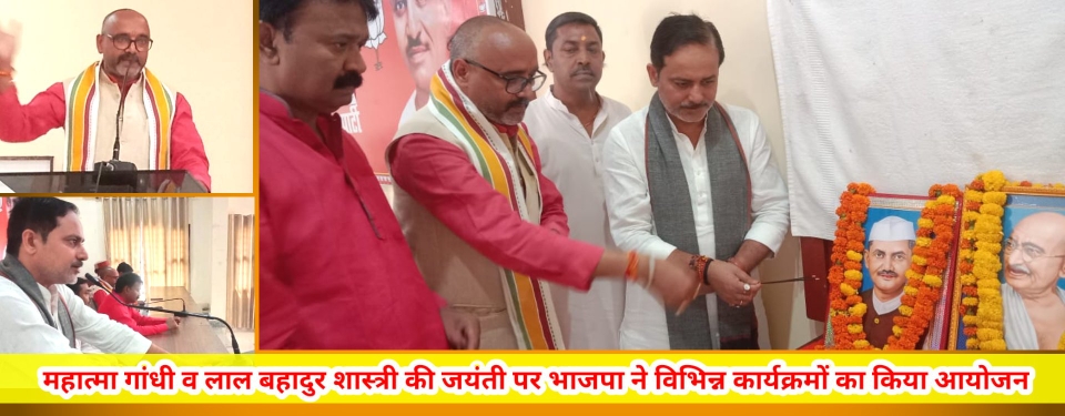 सोनभद्र। राष्ट्रपिता महात्मा गांधी व सादगी के प्रतीक पूर्व प्रधानमंत्री लाल बहादुर शास्त्री जी के जयन्ती पर भाजपा ने विभिन्न कार्यक्रम आयोजित किये। जिसमे भाजपा जिलाध्यक्ष अजीत चौबे की अध्यक्षता मे जिला कार्यालय पर दोनो महापुरुषों के चित्र पर भाजपा जिलाध्यक्ष अजीत चौबे, सदर विधायक भूपेश चौबे, घोरावल विधायक अनिल कुमार मौर्य, क्षेत्रीय अध्यक्ष अनुसूचित मोर्चा अजीत रावत सहित सभी कार्यकर्ताओं ने पुष्प अर्पित कर श्रद्धासुमन अर्पित किया।