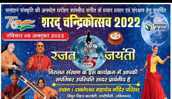 सोनभद्र। शक्ति संगीत कला परिषद शक्तिनगर सोनभद्र द्वारा मानव संसाधन अनुभाग एनटीपीसी एवं नार्दन कोलफील्ड्स प्राइवेट लिमिटेड के सहयोग से शरद पूर्णिमा 9 अक्टूबर 2022 दिन रविवार रात्रि 8:00 बजे शक्तेश्वर महादेव मंदिर परिसर, विद्युत बिहार कॉलोनी, एनटीपीसी शक्तिनगर में शास्त्रीय संगीत समारोह का आयोजन किया गया है।