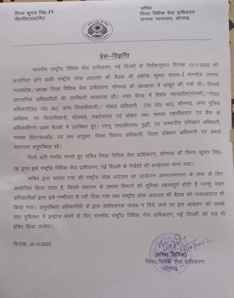 परंतु उप जिलाधिकारी दुद्धी, उप संभागीय परिवहन अधिकारी, डीएफओ ओबरा, रॉबर्ट्सगंज, रेणुकूट ,उप श्रम आयुक्त, जिला विकास अधिकारी ,जिला प्रोबेशन अधिकारी एवं प्रभारी यातायात अनुपस्थित रहे। जिसे अति गंभीर मानते हुए सचिव जिला विधिक सेवा प्राधिकरण सोनभद्र विनय कुमार सिंह द्वारा इसे राष्ट्रीय विधिक सेवा प्राधिकरण ,नई दिल्ली के निर्देशों की अवहेलना माना गया।