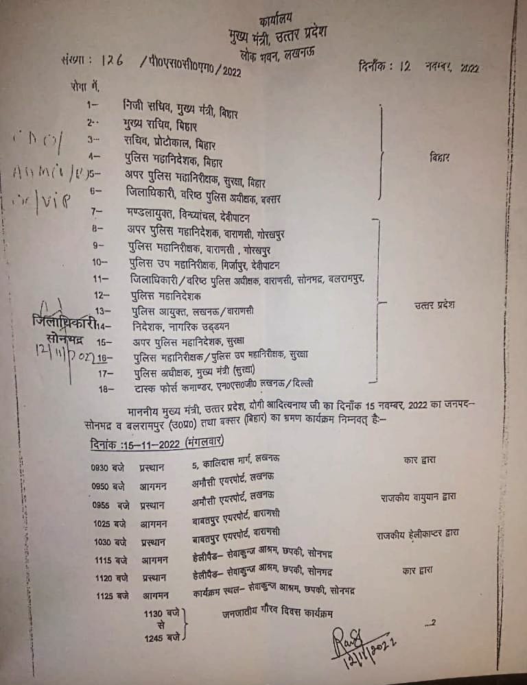 सोनभद्र। उत्तर प्रदेश के मुख्यमंत्री योगी आदित्यनाथ 15 नवंबर को सोनभद्र रहे हैं। मुख्यमंत्री के आगमन को लेकर जिला प्रशासन ने कमर कस ली पूरी तैयारियां जोरों शोरों से चल रही है। रविवार को मुख्यमंत्री का मिनट 2 मिनट कार्यक्रम जारी कर दिया गया।
