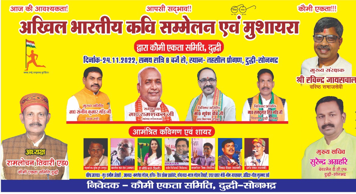 दुद्धी, सोनभद्र। राष्ट्रव्यापी कौमी एकता सप्ताह के अंतर्गत दुद्धी का ऐतिहासिक 37 वां कवि सम्मेलन एवं मुशायरा इस साल 24 नवम्बर को होने जा रहा है। वर्ष भर श्रोताओं को इंतजार कराने वाली कवि सम्मेलन एवं मुशायरे में प्रदेश के नई नामी गिरामी कवियों एवं शायरों को आमंत्रित किया गया है।