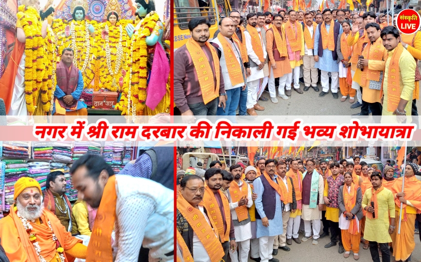 सोनभद्र। विश्व के कल्याण के लिए राबर्ट्सगंज नगर के आरटीएस क्लब मैदान में चल रहे श्रीरामचरित मानस नवाह्न परायण महायज्ञ के समापन पर सोमवार को मानस पंडाल में विशाल भंडारे का आयोजन किया गया। इसके बाद नगर में भव्य श्रीराम दरबार की शोभायात्रा निकाली गई। इस दौरान जय मां गायत्री जागरण ग्रुप के प्रसिद्ध भजन गायक सूरज गुप्ता और संगीतकार छोटू शुक्ला द्वारा श्रीराम के एक से बढ़कर एक भजनों को गाया गया। इस शोभायात्रा में 108 भूदेव हाथों में भगवा ध्वज लिए एवं श्री राम भक्त भजनों के धुन पर नाचते गाते जयसिया राम का गगनभेदी जयघोष लगाते हुए शामिल हुए।
