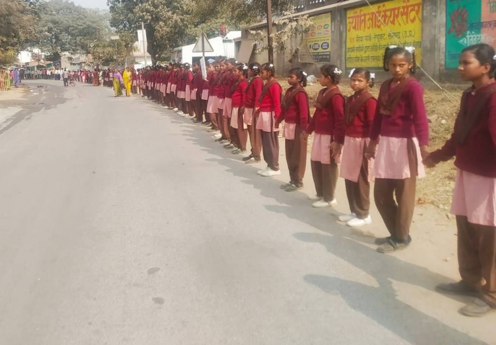 म्योरपुर, सोनभद्र। म्योरपुर ब्लॉक के अन्तर्गत स्थानीय विद्यालयों बिड़ला विद्या मंदिर इ० का० म्योरपुर, मून स्टार इंग्लिश स्कूल, कस्तुरबा गांधी बालिका विद्यालय, माँ महा मैत्रायिनी योगिनी इ० का० म्योरपुर, कैमूर इ० का० म्योरपुर प्रा० वि० म्योरपुर द्वितीय इत्यादि विद्यालयों के विद्यार्थियों व शिक्षकों द्वारा सामुदायिक स्वास्थ्य केन्द्र से लेकर ब्लॉक मुख्यालय तक लम्बी मानव श्रृंखला बनायी गयी।