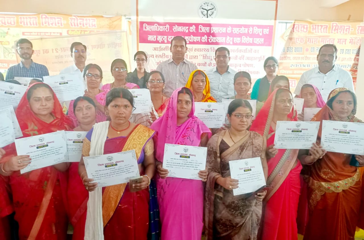 सोनभद्र। जिलाधिकारी चन्द्र विजय सिंह की विशेष पहल पर जिला प्रशासन के सहयोग से शिशु एवं मात मृत्यु दर तथा कुपोषण की रोकथाम के लिए विकास भवन में आई0सी0डी0एस0 व स्वास्थ्य विभाग के कार्यकत्रियों को राज्य स्तरीय प्रशिक्षकों द्वारा प्रशिक्षण दिया गया। इस अवसर पर जिलाधिकारी चन्द्र विजय सिंह ने कहा कि ‘‘शिशु एवं छोटे बच्चों को आहारपूर्ति, अति गंभीर कुपोषित बच्चों के प्रबन्धन, मातृत्व पोषण, नवजात शिशुओं की देख-भाल तथा वृद्धि निगरानी‘‘ विषयक जनपद में आयोजित तीन दिवसीय प्रशिक्षण प्राप्त कार्यकत्रितयों को प्रमाण-पत्र का वितरण किया जा रहा है।