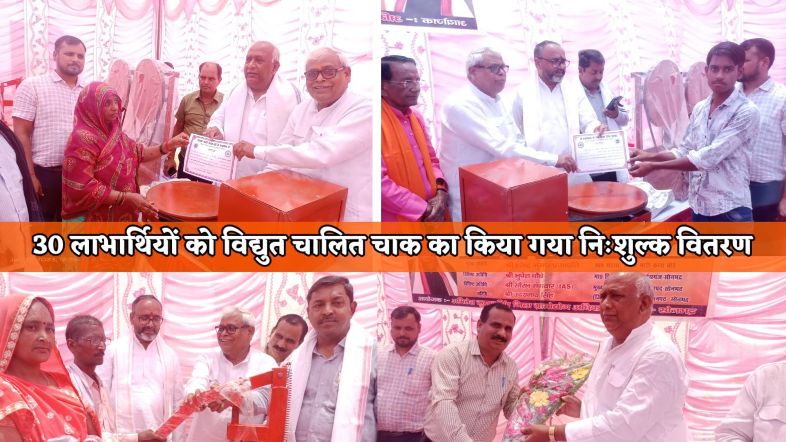 सोनभद्र। जिला ग्रामोद्योग व खादी कार्यालय द्वारा उ0प्र0 माटी कला बोर्ड के तत्वाधान में 30 लाभार्थियों को सदस्य हरेन्द्र कुमार प्रजापति, सांसद राज्यसभा राम शकल, विधायक सदर भूपेश चौबे द्वारा प्रमाण पत्र व विद्युत चालित चाक का निःशुल्क वितरण जिला ग्रामोद्योग कार्यालय के पास मैदान में किया गया। कार्यक्रम का शुभारम्भ सदस्य, सांसद राज्यसभा राम शकल, विधायक सदर, अपर जिला सूचना अधिकारी विनय कुमार सिंह द्वारा गॉधी जी के चित्र पर माल्यापर्ण कर किया गया।