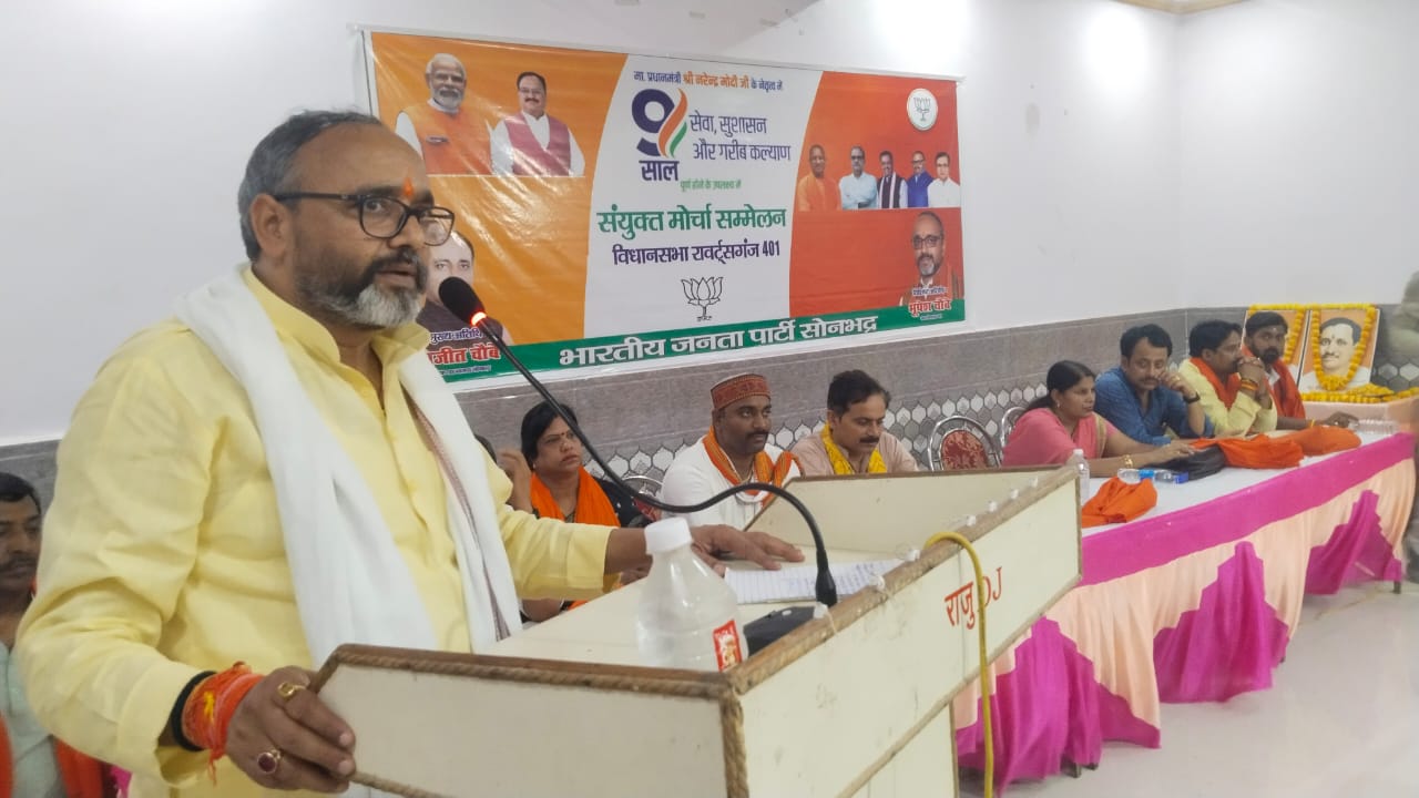 सोनभद्र। केन्द्र की मोदी सरकार के सफलतम 9 वर्ष पूर्ण होने पर भारतीय जनता पार्टी द्वारा चलाये जा रहे महासंपर्क अभियान के तहत सोमवार को राबर्ट्सगंज विधानसभा का संयुक्त मोर्चा सम्मेलन रामलीला कैंपस डाला मे आयोजित हुआ। सम्मेलन मे बतौर मुख्यअतिथि सदर विधायक भूपेश चौबे मौजूद रहे। कार्यक्रम का शुभारंम्भ पं0 दीनदयाल उपाध्याय व डॉ0 श्यामा प्रसाद मुखर्जी जी के चित्र पर सदर विधायक भूपेश चौबे व भाजपा जिलाध्यक्ष अजीत चौबे राबर्ट्सगंज नगर पालिका चेयरमैन रुबी प्रसाद ने दीप प्रज्ज्वलित कर किया।
