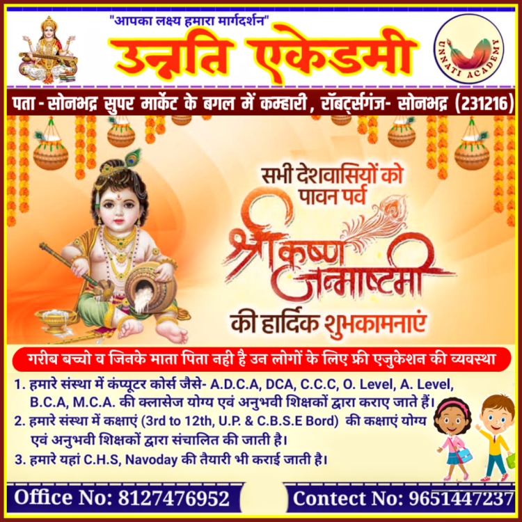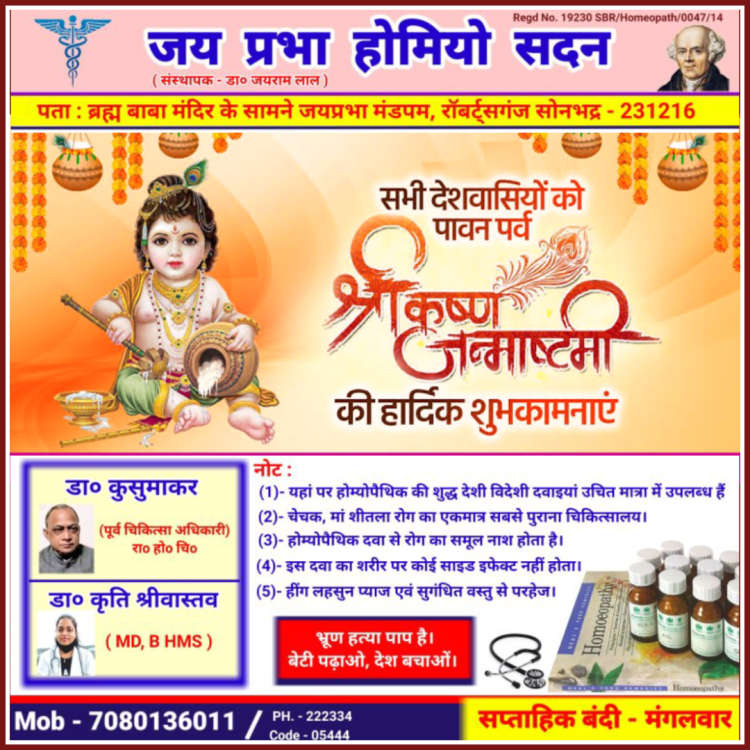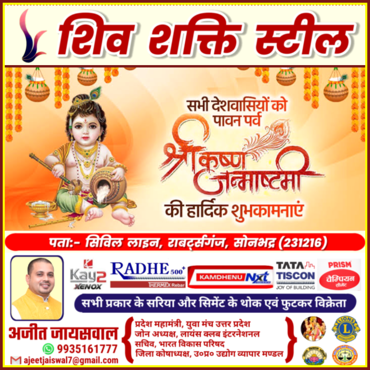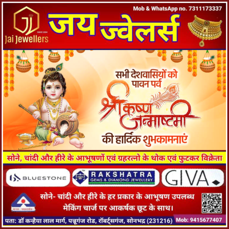 बता दे की हर वर्षों की भांति इस वर्ष भी रॉबर्ट्सगंज कोतवाली में भव्य श्री कृष्ण जन्मोत्सव का कार्यक्रम आयोजन किया गया है। प्रभारी निरीक्षक लक्ष्मण पर्वत ने सभी श्री कृष्ण भक्तों से आग्रह किया है कि अधिक से अधिक संख्या में श्री कृष्ण जन्म उत्सव समारोह में आए और पुण्य के भागी बने तो वही नगर के मध्य श्री राम जानकी संकट मोचन मंदिर और उत्तर मोहाल स्थित दुग्धेश्वर महादेव मंदिर पर श्री कृष्ण जन्म उत्सव का कार्यक्रम धूमधाम के साथ मनाया जाएगा।