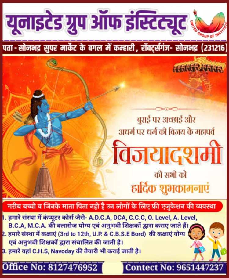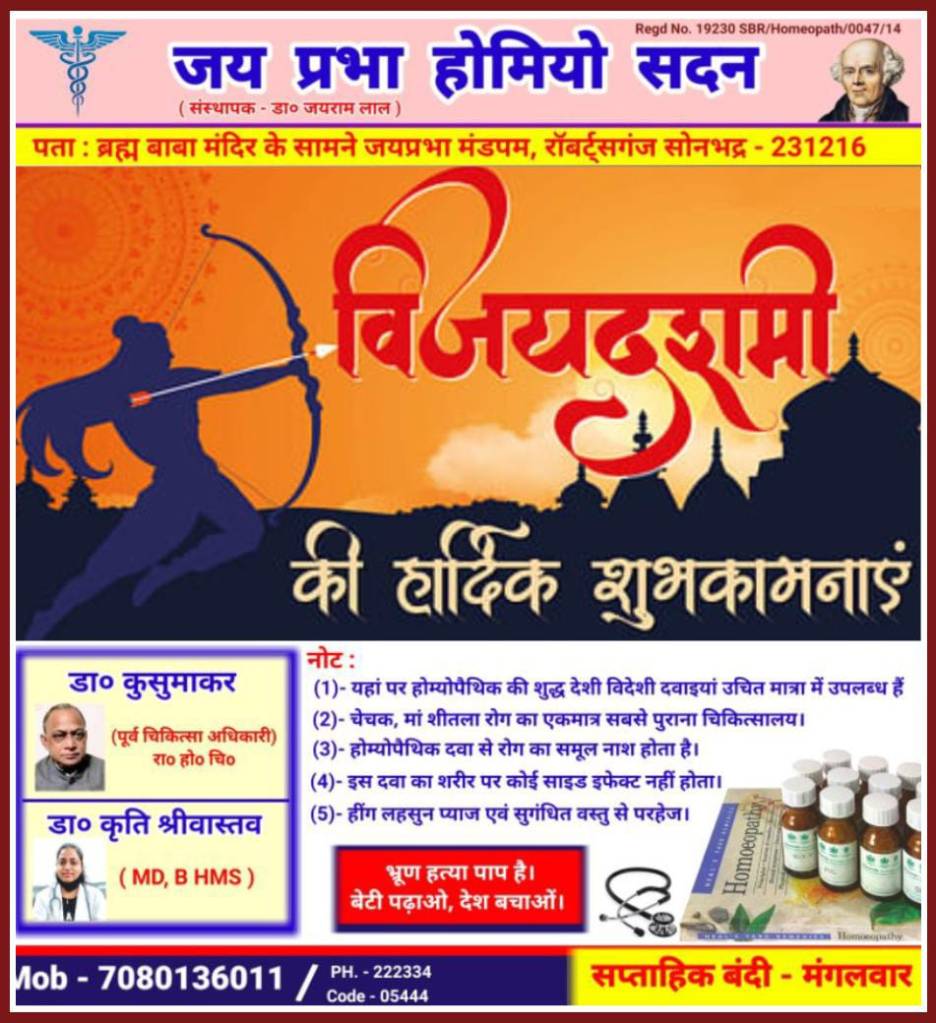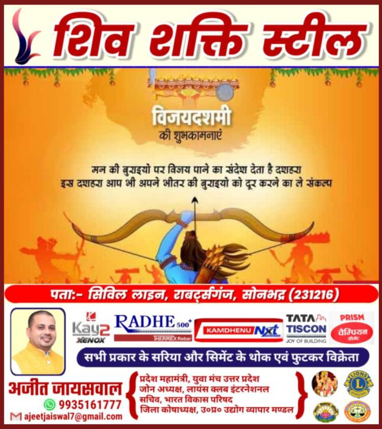 सोनभद्र। राष्ट्रीय स्वयंसेवक संघ सोनभद्र नगर द्वारा नगर स्थित स्वामी विवेकानंद प्रेक्षागृह में विजयदशमी उत्सव बहुत ही धूमधाम व हर्षोल्लास के साथ मनाया गया। कार्यक्रम का शुभारंभ भगवान श्रीराम जी के तस्वीर पर माल्यार्पण व पुष्प अर्पित कर कार्यक्रम की अध्यक्षता कर रहे सोनभद्र जिला संघ चालक हर्ष अग्रवाल द्वारा शस्त्र पूजन से हुआ। तत्पश्चात गीत, अमृत वचन किया गया।
