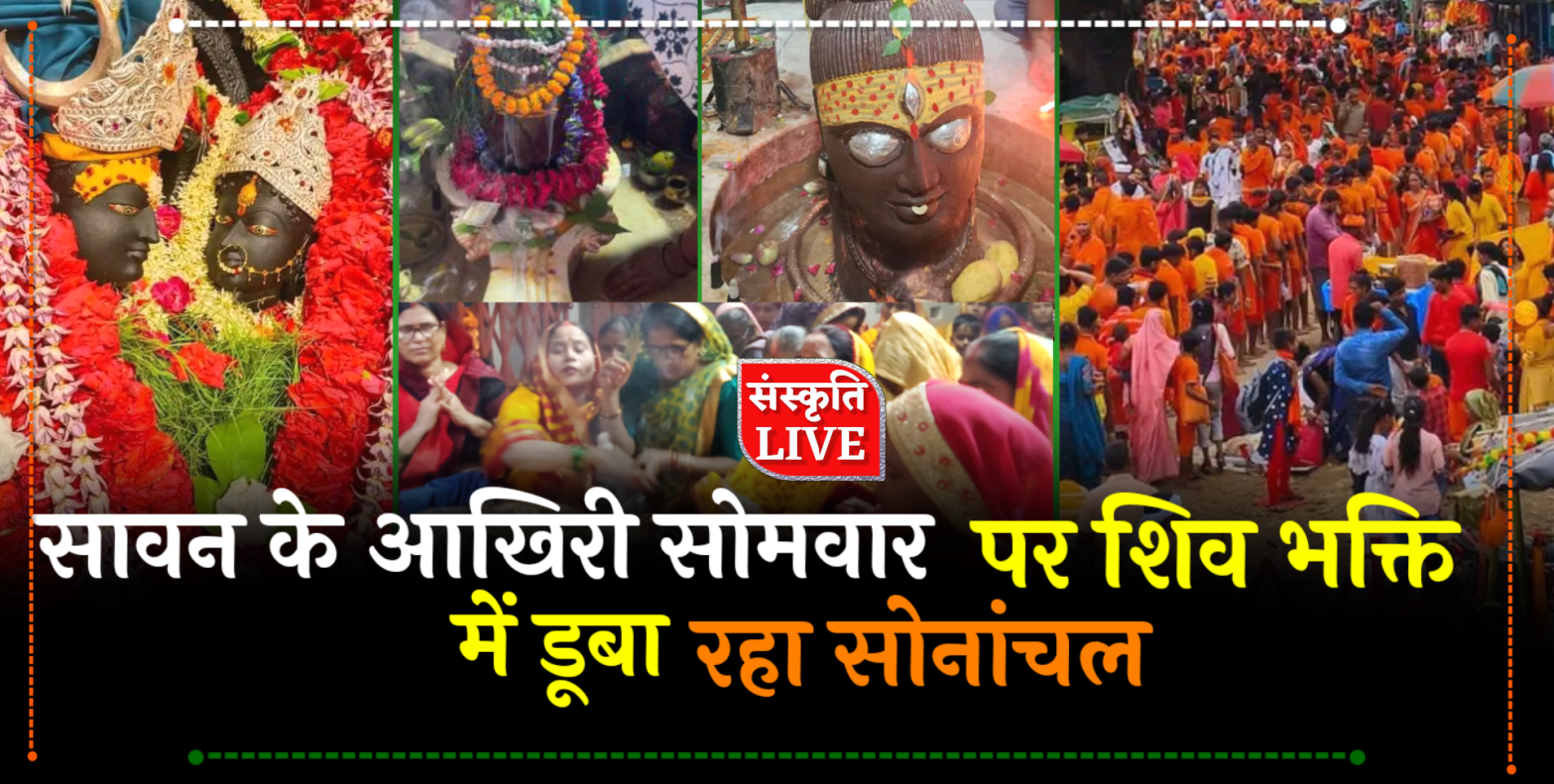 सोनभद्र। सावन के आखिरी सोमवार को पूरा सोनांचल शिव भक्ति में डूबा रहा। इस अवसर पर दर्शन पूजन करने के लिए शिवालयों में बड़ी संख्या में श्रद्धालुओं की भीड़ पहुंची। श्रद्धालुओं ने जल एवं दूध से भगवान भोलेनाथ का अभिषेक कर विधि विधान से पूजन अर्चन किया। तो कई शिव भक्तो ने शिवालयों तथा घरों में रुद्राभिषेक कराया।
