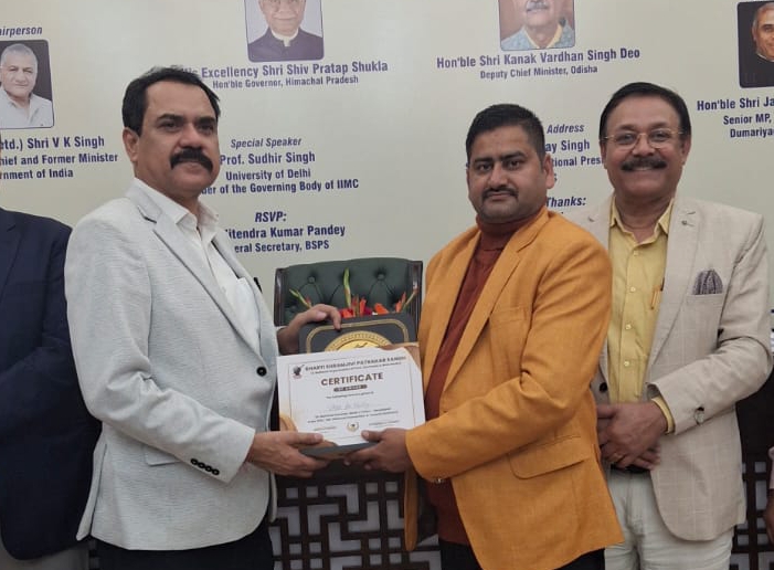 सोनभद्र। दिल्ली में भारती श्रमजीवी पत्रकार संघ (प्रिंट, इलेक्ट्रॉनिक और वेब मीडिया का एक राष्ट्रीय संगठन) ‘मोदी विजन-विकसित भारत 2047’ का कार्यक्रम का भव्य आयोजन किया गया। जिसमें जिले का प्रतिनिधत्व कर रहे पूर्वांचल मीडिया क्लब के अध्यक्ष विवेक कुमार पाण्डेय को पत्रकारिता के क्षेत्र में उत्कृष्ठ योगदान के लिए उन्हें सम्मानित किया गया।
