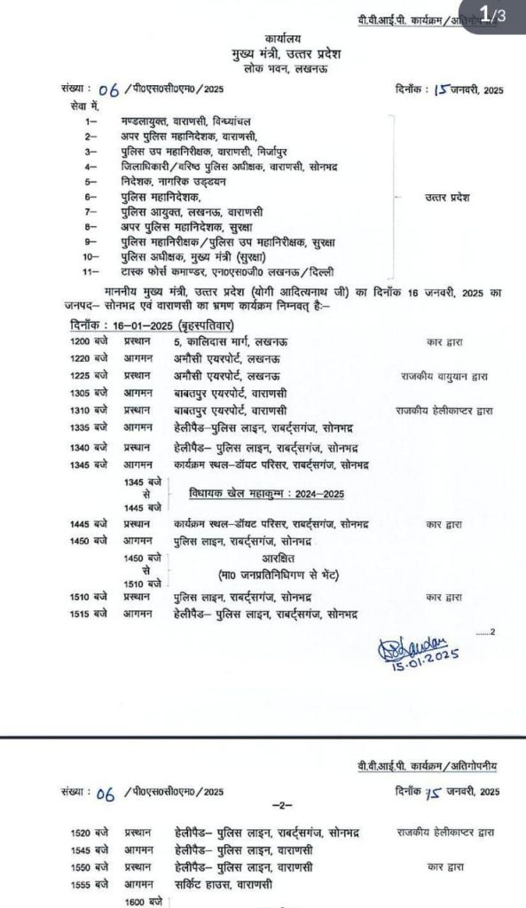 दोपहर 2.45 मिनट पर सीएम योगी पुलिस लाइन के लिए प्रस्थान करेंगे। दोपहर 2.50 से 3.10 बजे तक पुलिस लाइन में जनप्रतिनिधियों के साथ मुलाक़ात करेंगे। इसके पश्चात 3.15 बजे हेलीकाप्टर द्वारा पुलिस लाइन वाराणसी के लिए प्रस्थान करेंगे।