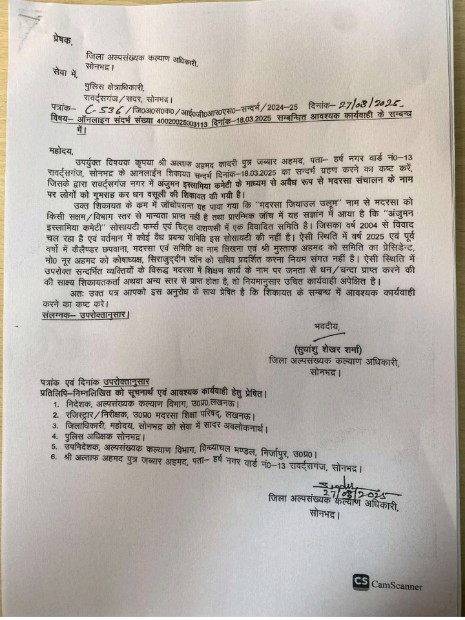 सोनभद्र। रॉबर्ट्सगंज कोतवाली अंतर्गत कस्बा रॉबर्ट्सगंज निवासी अल्ताफ अहमद क़ादरी द्वारा जिला अल्पसंख्यक कल्याण अधिकारी को जन सुनवाई पोर्टल के माध्यम से शिकायत लिखा किया था जिसमें उन्होंने अंजुमन इस्लामिया कमेटी के सदर मुश्ताक अहमद व सेकेट्री सिराजुद्दीन खान के ऊपर मेन मार्केट जामा मस्जिद के पीछे भवन में अवैध रूप से मदरसा संचालित किए जाने व विगत लगभग पांच वर्षों से मदरसे में शिक्षार्थी अनाथ बच्चों के रहने व भोजन इत्यादि की व्यवस्था के नाम पर अवैध वसूली कर