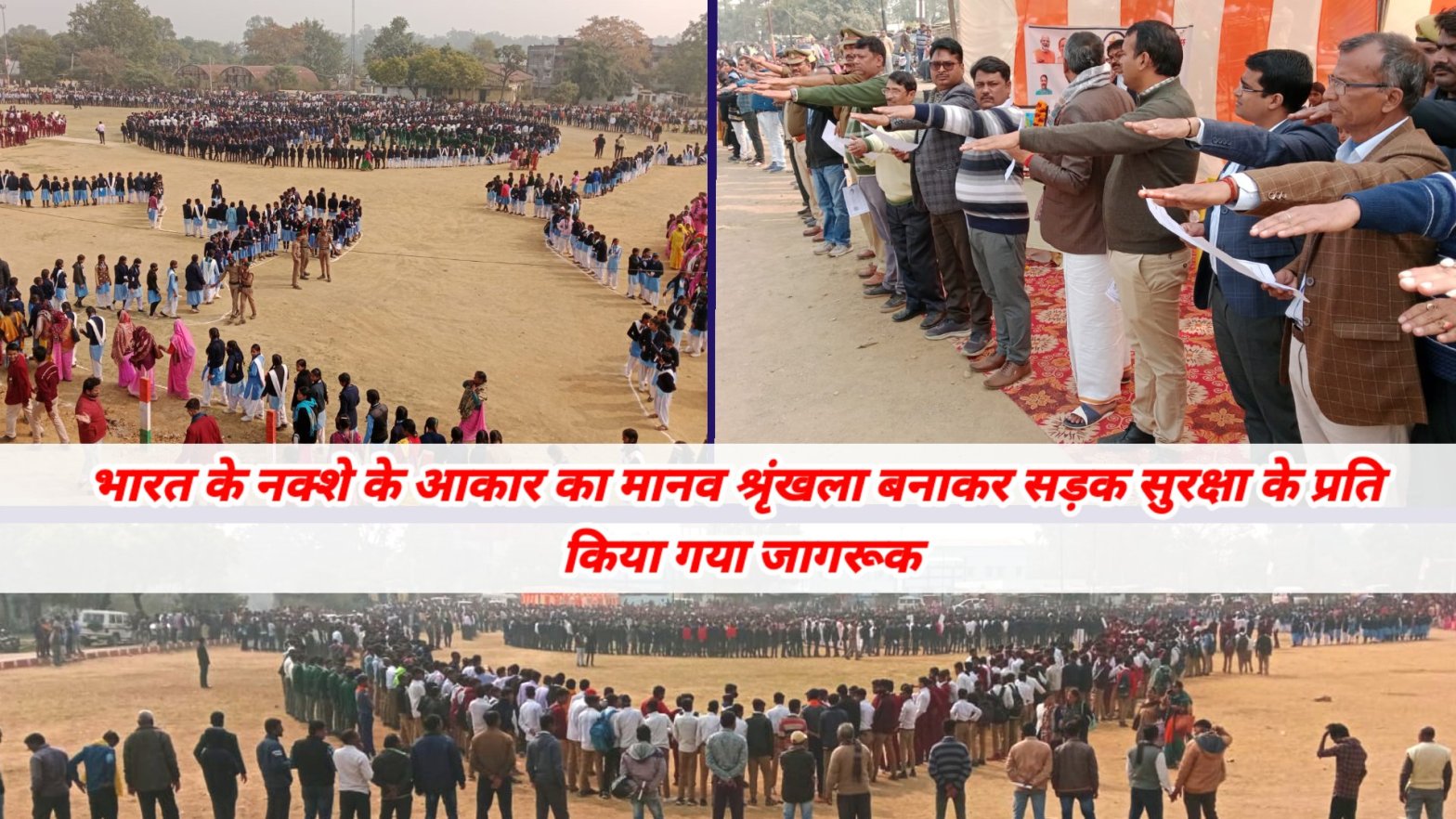 सड़क सुरक्षा के प्रति जागरूक करने के उद्देश्य से भारत के नक्शे के रूप में प्रदर्शित किया गया मानव श्रृंखला