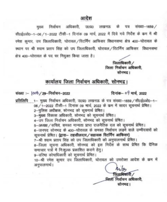 वाहन में सादे मतपत्र के मामले में चुनाव आयोग का एक्शन, बदले गए घोरावल के रिटर्निंग आफिसर