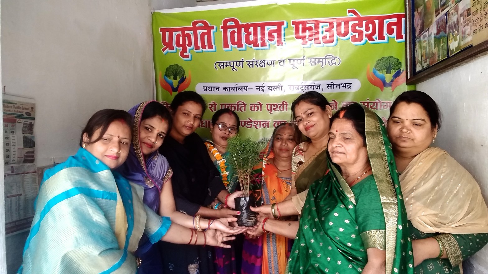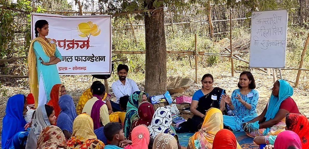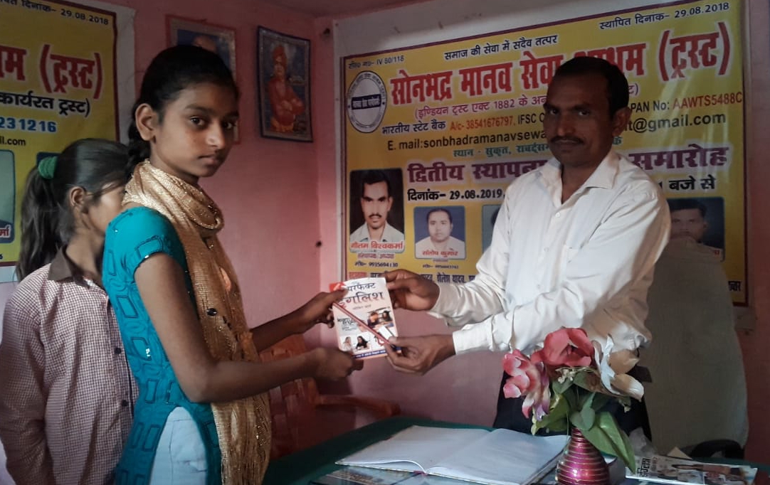 Distribution of text material to girls on International Women’s Day by Sonbhadra Manav Seva Ashram Trust.