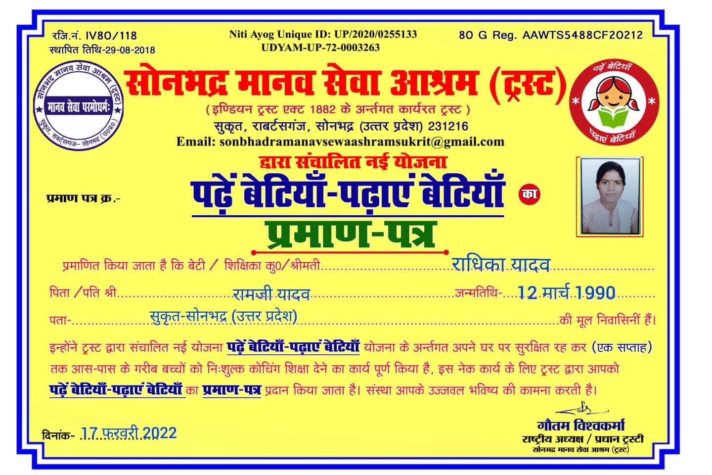राधिका यादव को मिला “पढ़ें बेटियाँ- पढ़ाएं बेटियाँ” का प्रमाण-पत्र