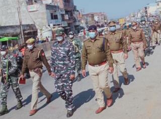 चोपन में पुलिस प्रशासन व सीआरपी के द्वारा नगर के विभिन्न इलाकों में फ्लैग मार्च किया गया