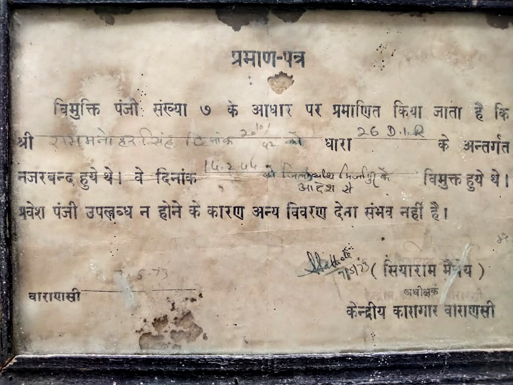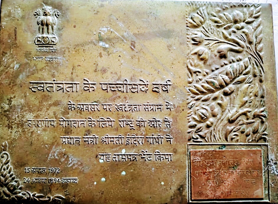 स्वतंत्रता संग्राम सेनानी राम मनोहर सिंह को प्रधानमंत्री द्वारा प्रदत्त ताम्र पत्र