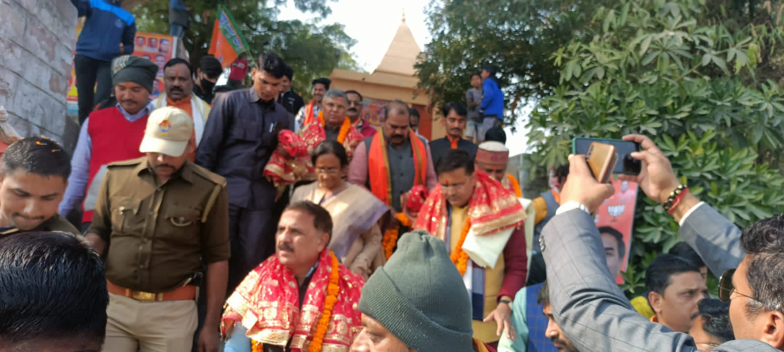 मंदिर परिसर पर भारतीय जनता पार्टी अहरौरा मंडल के उपाध्यक्ष उमेश कुमार केसरी ने अतिथियों का माता रानी के चुनरी देकर स्वागत किया उसके बाद काफिला जमुई अहरौरा मार्ग स्थित मेहंदीपुर चौराहे पर पहुंचा जहां सैकड़ों महिला भाजपा कार्यकर्ता उपस्थित होकर जन विश्वास यात्रा में आए लोगों पर पुष्प वर्षा कर रही थी तथा चौराहे पर अहरौरा एवंअदलहट मंडल के कार्यकर्ताओं ने माल्यार्पण कर स्वागत किया।